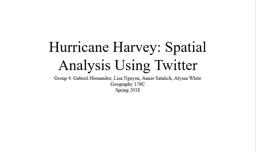 Hurricane Harvey: Spatial Analysis Using Twitter was a collaborative project conducted by my classmates and me as part of the final sequence in GIS Design and Applications at UC Santa Barbara. Spanning ten weeks, the project culminated in a final presentation at Spatial@UCSB 2018.